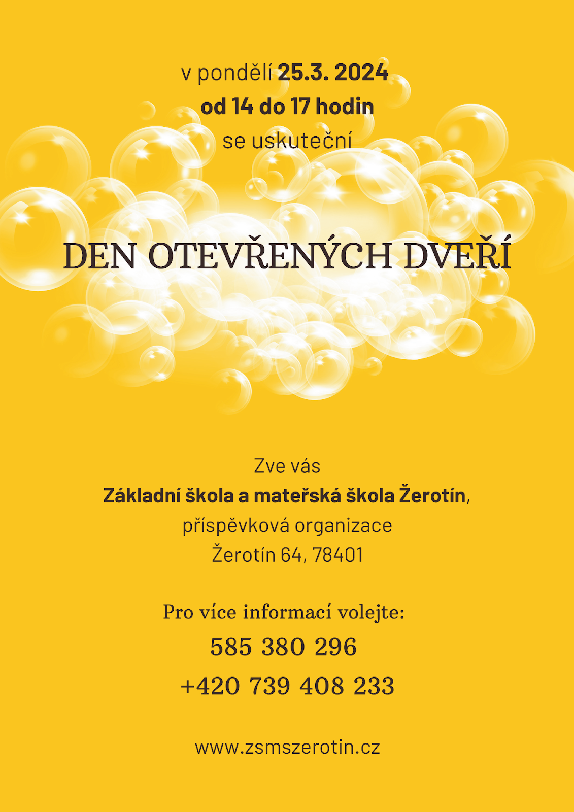 V pondělí 25.3.2024 od 14 do 17 hodin se uskuteční DEN OTEVŘENÝCH DVEŘÍ. Zve Vás Základní škola a mateřská škola Žerotín.